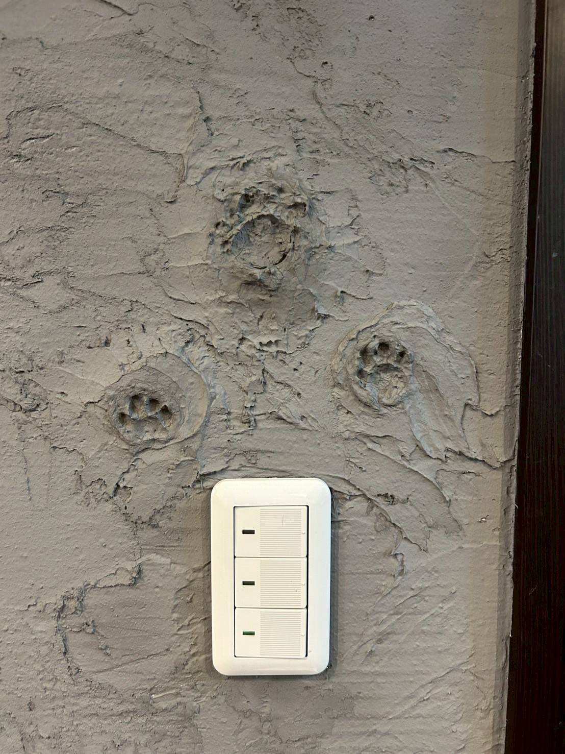写真のスイッチ横に並んだ3つの足跡。毎日電気をつけるたびに、この時の楽しかった記憶が蘇ります。ワンちゃんや猫ちゃんにとっても、ここは「自分の家なんだ」という証。年月が経ち、ペットが成長したり、たとえお別れの時が来たとしても、この壁には確かに彼らがいた温もりが残り続けます。