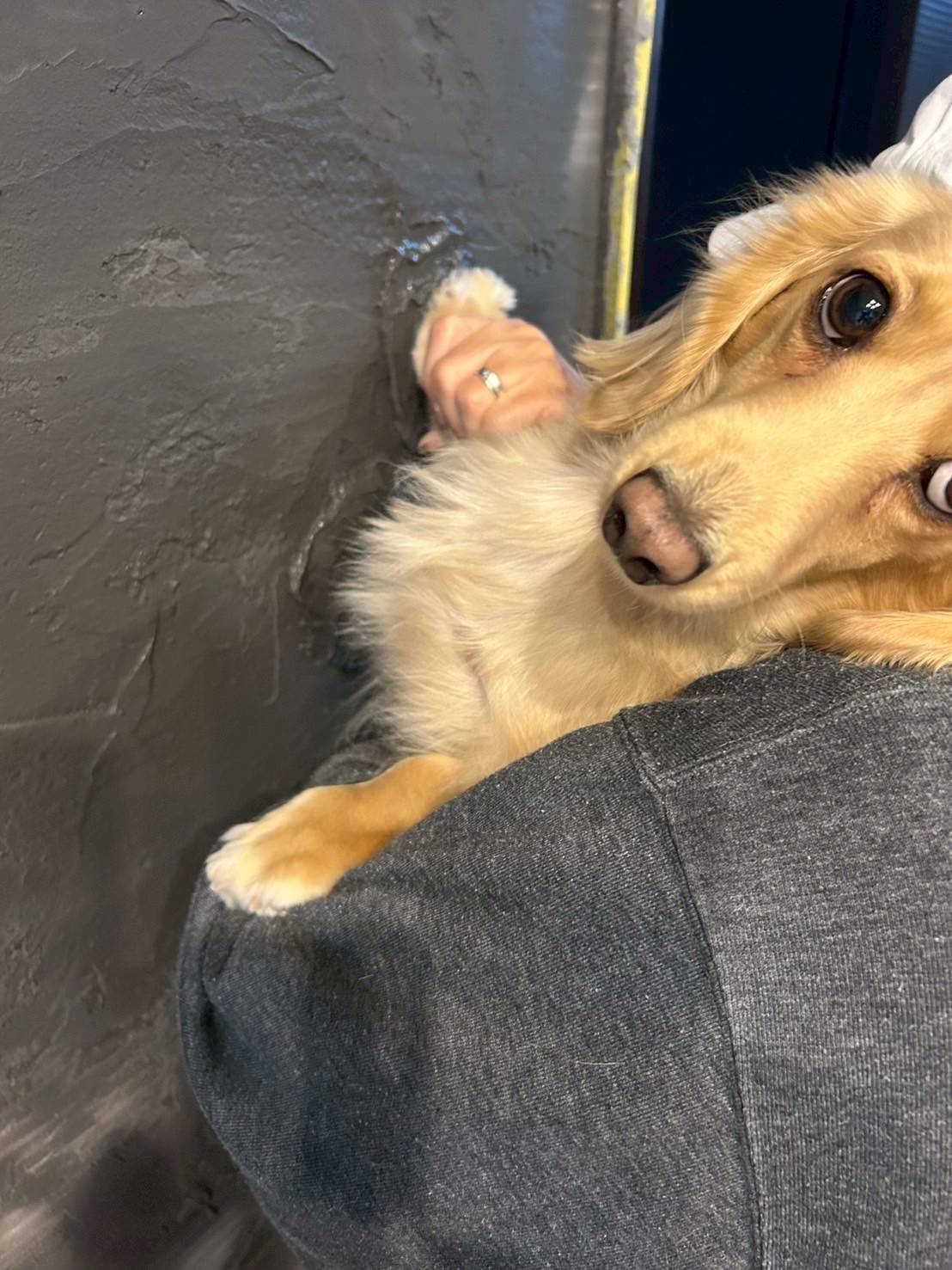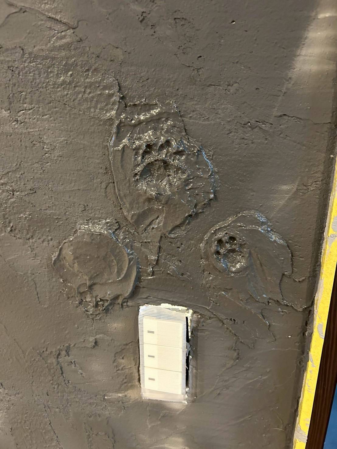 手形を残すコツ: 壁を塗り終えた直後、少し水分が引いてきたタイミングで優しく押し当てます。あまり強く押しすぎると周囲の壁が崩れてしまうので、サポートする人がペットの足を優しくガイドしてあげましょう。